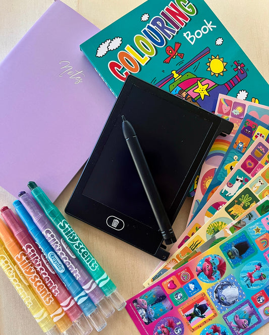 Allow your kids imagination to run wild with our mini activity packs. Compact, convenient and packed with goodies, it will keep the kids busy while on the go and guess what? No planning required! Just leave it in your handbag or car for when you need it.